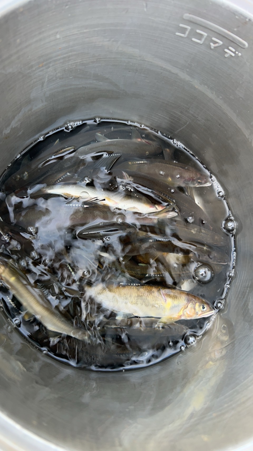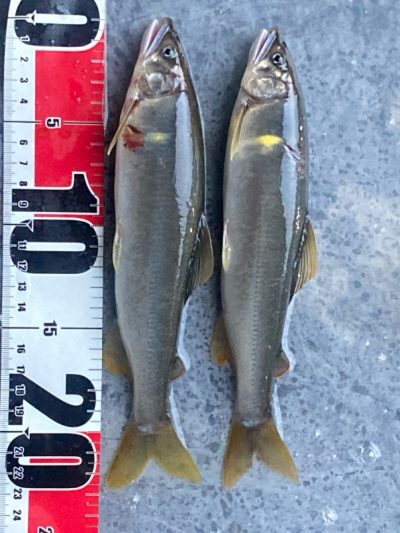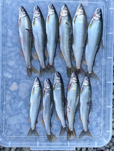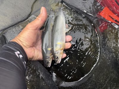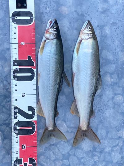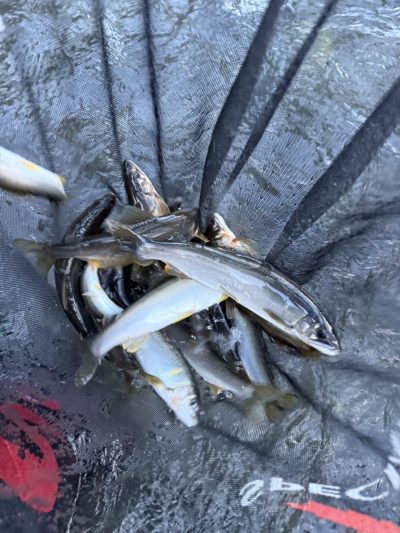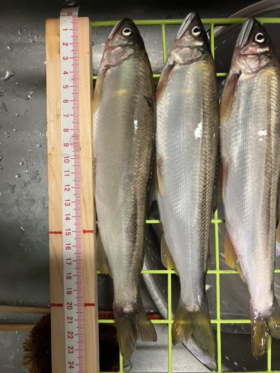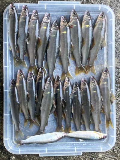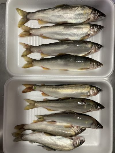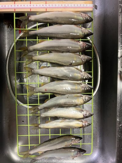 コーヒーご馳走様でした。合流下流で12匹でしたが、見切れ1匹、頭上に木があり引き寄せてタモまで50cmのところで、納竿寸前に24cmのオトリと同サイズの掛け鮎をライン切れでリリース!サイズは24×5匹/23×3匹/22×1匹/21×2匹でした。😞15時上がりです。